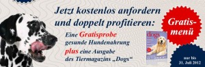 Dinner for Dogs verschickt aktuell kostenlose Proben unter dem Motto: “Frische wie selbst zubereitet. Wir laden Ihren Hund zum Testessen ein.” Gleichzeitig bekommt man gratis und unverbindlich die aktuelle Ausgabe des Tiermagazins „Dogs“ zugeschickt.