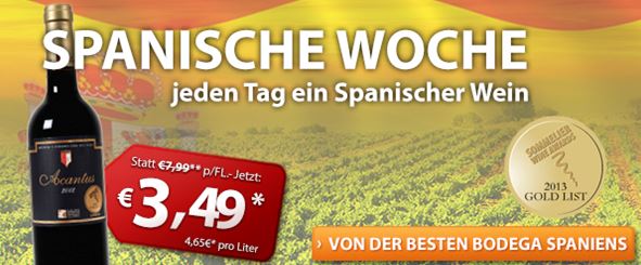Und weiter gehen die Rotweinschnäppchen bei weinvorteil.de. Nur heute wurde dort der Bodegas y Viñedos Casa del Valle – Acantus von 7,99€ auf 3,49€ reduziert. Ab einem Bestellwert von 35€ kann man noch unseren 15€ Gutscheincode WVT1402TWM einsetzen und landet damit beim Kauf von 12 Flaschen beim Sensationspreis von 2,24€ pro Flasche.