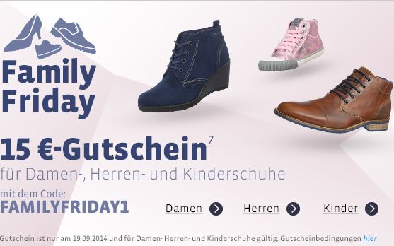 Mit dem Gutscheincode FAMILYFRIDAY1 gibt es bei mirapodo.de nur heute einen 15€ Rabatt beim Kauf von Damen-, Herren-, oder Kinderschuhen. Alternativ gibt es durch den Code MYSELF14BONUS einen 14,95€ Rabatt ab 49€ MBW.