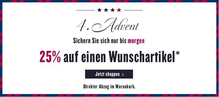 Tom Tailor gibt eine Liefergarantie bei Bestelleingang bis 22.12.14 um 10:00 Uhr. Außerdem gibt es nur heute einen 25% Rabatt auf einen Wunschartikel.
