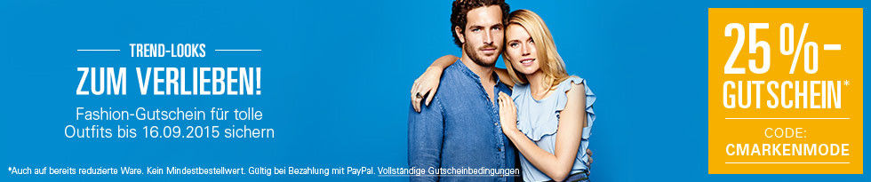 Durch den Gutscheincode CMARKENMODE und die Bezahlung mit Paypal gibt es 25% Rabatt auf über 2300 verschiedene, bereits reduzierte Kleidungsstücke. Die Aktion endet am 16.09.2015.