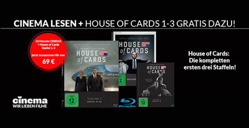 Das Jahresabo der meiner Meinung nach mit Abstand besten Filmzeitschrift Cinema kostet 69€. Als Zugabe erhält man die ersten 3 Staffeln der Kultserie House Of Cards mit Kevin Spacey in Höchstform.