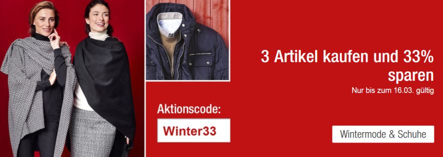 Vom 10.03. bis zum 16.03.16 gibt es bei Galeria beim Kauf von bereits reduzierter Wintermode & Schuhe mit dem Aktionscode Winter33 einen zusätzlichen Rabatt von 33%.