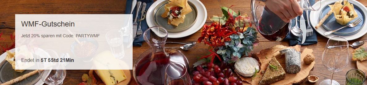 Durch den Gutscheincode PARTYWMF und die Bezahlung per Paypal gibt es bis zum 20.09.2017 einen 20% Rabatt auf Angebote der Marke WMF.