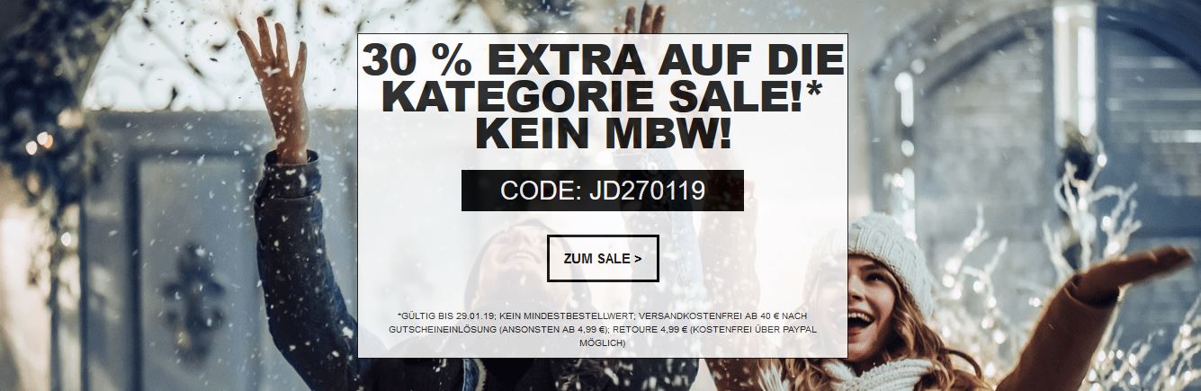 Durch den Code JD270119 gibt es bis zum 29.01.2019 bei jeans-direct.de einen zusätzlichen 30% Rabatt auf alle Artikel im Sale. Der MBW liegt bei 40€, ab 40€ erfolgt die Lieferung übrigens auch versandkostenfrei.