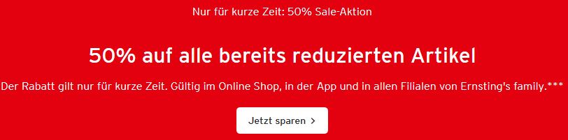 Für die nächsten zwei Tage gibt es bei Ernstings family einen 50% Extra-Rabatt auf alle bereits reduzierten Artikel. Ein Gutscheincode wird nicht benötigt, die 50% werden automatisch im Warenkorb abgezogen.